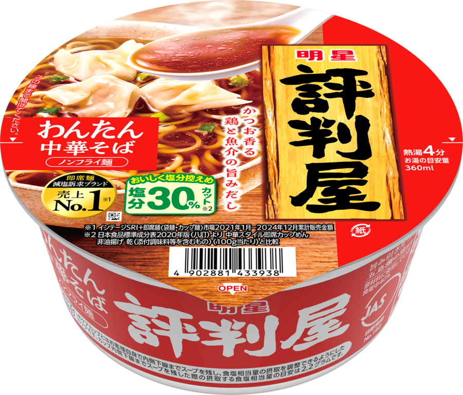 明星 評判屋 わんたん中華そばは塩分を30%カットされたワンタン入りのラーメンです。鶏と魚介のだしがベースです。12月1日発売の商品です。