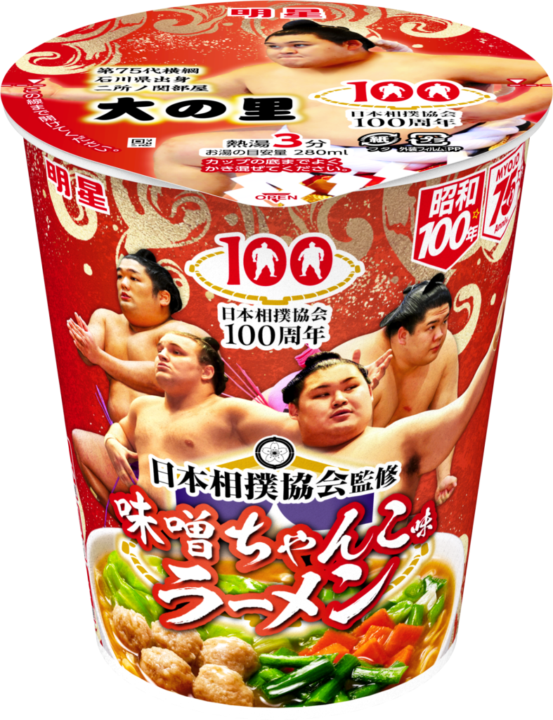 明星 日本相撲協会監修 味噌ちゃんこ味ラーメン設立100周年の「日本相撲協会財団法人」と×創立75周年の「明星食品」がコラボした、相撲部屋のちゃんこ鍋を再現した、具沢山で力強い味わいのカップめんです。