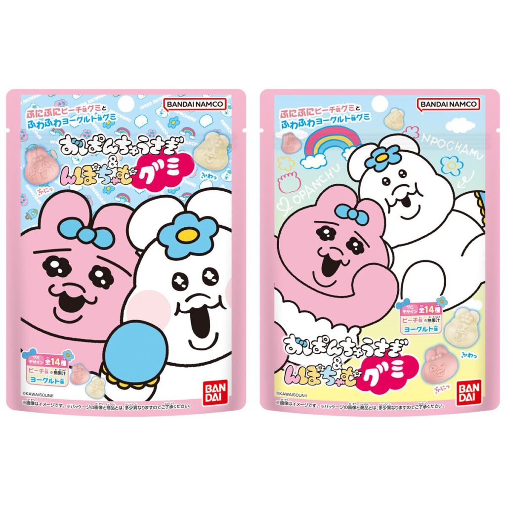 おぱんちゅうさぎ&んぽちゃむグミは、キャラクターの形が可愛い、モモ味とヨーグルト味のグミです。